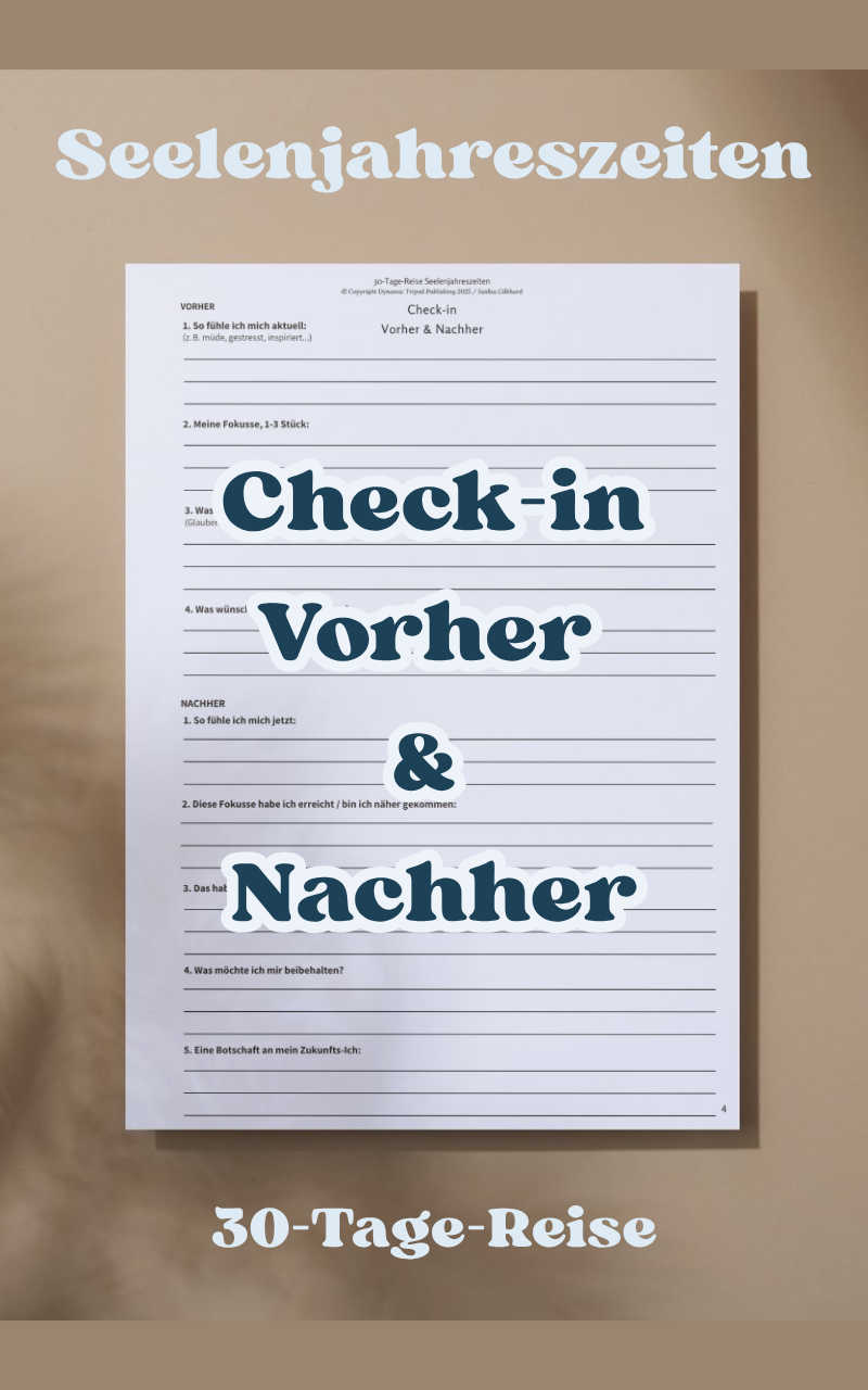 - 30 Tageseinheiten sowie Einstimmungsübungen, 30-Tage-Kalender, Vorlage für Fokus setzen+Rückblick+Blick in die Zukunft, Vorher/Nachher-Check in