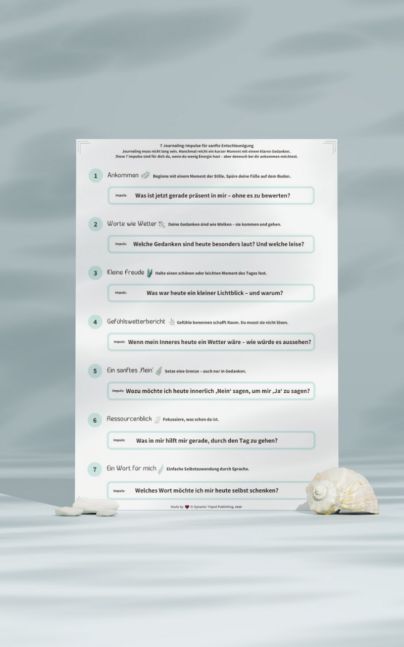 Für alle, die wieder mehr bei sich ankommen wollen – ohne Druck. Kein klassisches Tagebuch, keine Selbstoptimierung. Sondern eine Einladung, dein Inneres leise sprechen zu lassen.